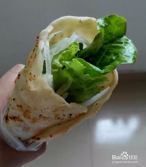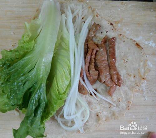 饼中可涂上自己喜欢的酱料,放入里脊肉,黄瓜丝和生菜卷起来即可开吃