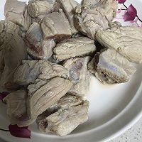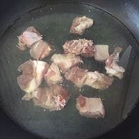 开锅,加入水烧开,排骨剁成小块,放入热水中过一下,捞起来备用。