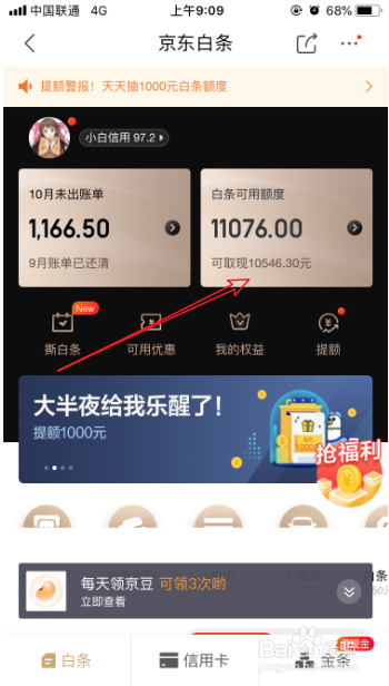 打开京东白条后,页面右上角有白条可用额度和可取现金额,我们点击它