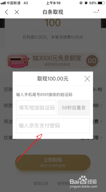 然后我们验证京东绑定手机号,输入京东支付密码即可成功取现了