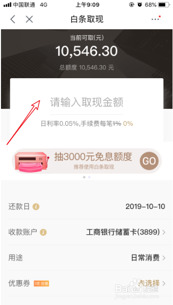 进入白条取现页面后,可以看到当前可取现的金额【和白条剩余额度相关】,我们输入想要提现金额