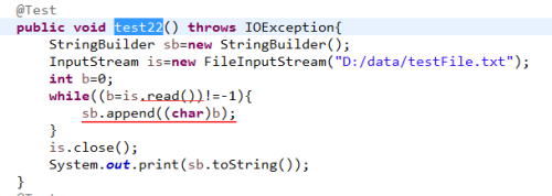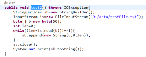 4、定义循环:将文件流中的数据读取到b数组中,直到read返回-1;-1表示已经到达文件末尾。将每次读取到的数据存储到StringBuilder中。
