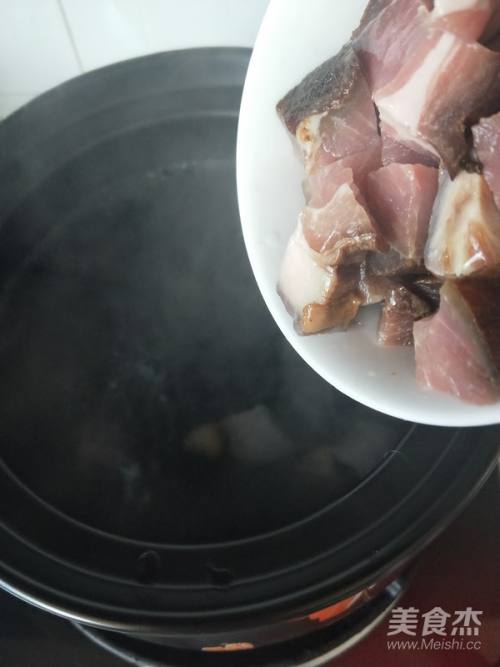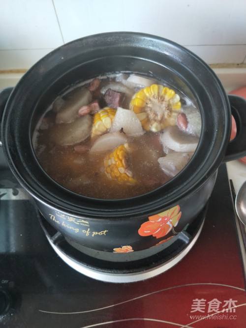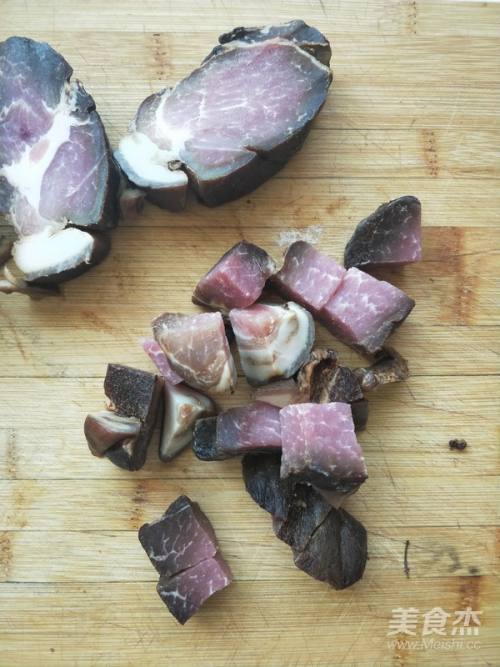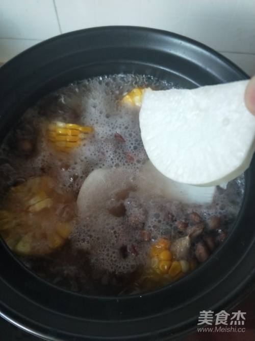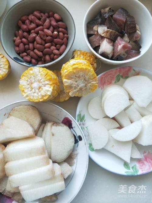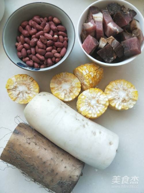 5腊肉,花生,玉米段先用清水冲洗,山药削皮切块,白萝卜切块。