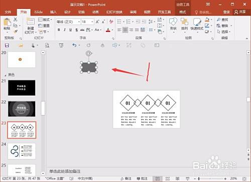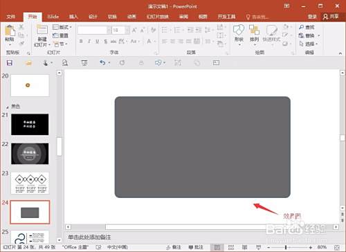 第一步,先把整个PPT页面,缩放到最小,然后在其左上角的位置,插入一个形状,比如是矩形形状,大小可以随意,起一个固定作用。