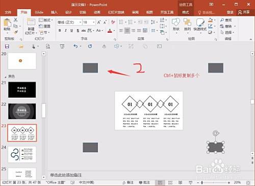 第二步,然后进行一个复制操作,可以使用Ctrl来帮忙,操作比较简单,这里就简单概述了,复制四个形状,分别位于四个角落就行。