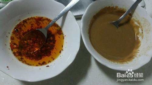 调了两个酱,第一个是爆香的花椒辣椒面油,加了芝麻油、酱油、醋、盐和糖。第二个就在第一个基础上加了两勺稀释了的芝麻酱。