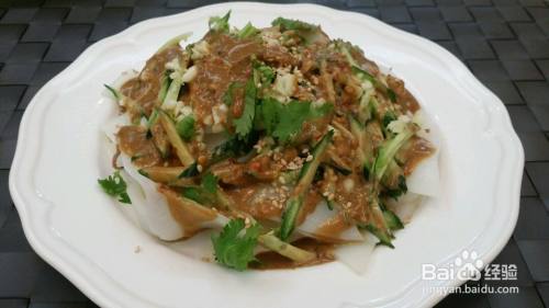 成品2,放了芝麻酱的那个酱料,撒了熟芝麻、香菜末、青瓜丝和蒜末。