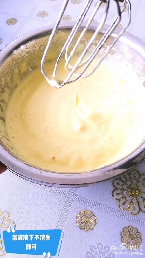 蛋液打发,一直打到提起打蛋器,蛋糊呈柱状下流,纹路不会马上消失的状态