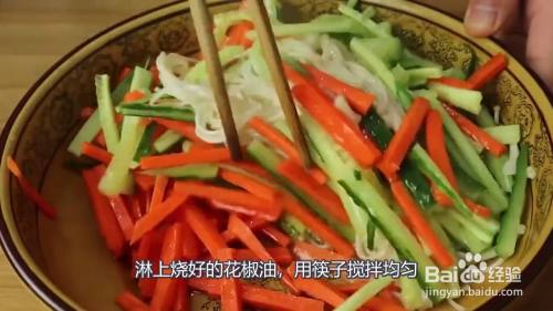 焯水的金针菇放入碗中,倒入胡萝卜丝和黄瓜丝,淋上烧好的花椒油,用筷子搅拌均匀。