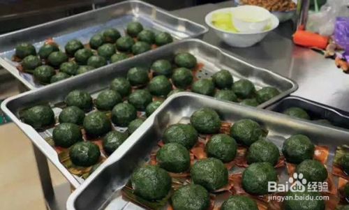 5清明粿,主要原料为鼠曲草(秋菊), 粳米,将捣烂的秋菊和粳米浆和在一起,包上茶馅蒸熟即可食用。