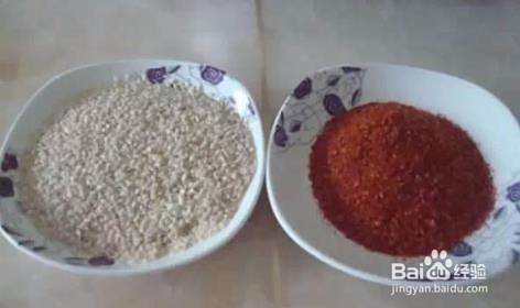 准备好配料:白糖、食盐、胡椒粉、辣椒面、姜、芝麻、少许生抽、花生油。