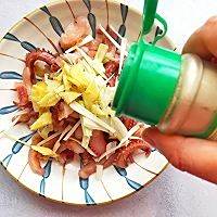 葱姜分别洗净切葱段和姜片放入切好的鱿鱼须盘中倒入1匙蚝油,1匙料酒和适量胡椒粉用手抓匀腌制10分钟。
