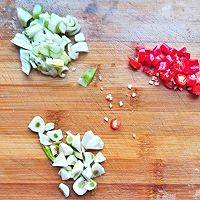 另取一块葱,和去皮的蒜小米辣洗净切成葱末,蒜丁和辣椒末。
