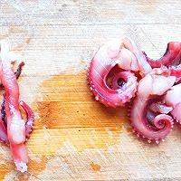 所有食材都准备好,买回来的鱿鱼须清洗干净用刀刮几道倒入盘中备用。