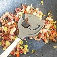 倒入焯好的鱿鱼须翻炒均匀后倒入半匙生抽半匙生抽半匙老抽和适量白糖1匙食用盐大火翻炒至鱿鱼须变干。