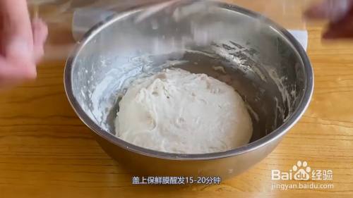 往面里加2克碱、10克水,盖上保鲜膜醒发15-20分钟。