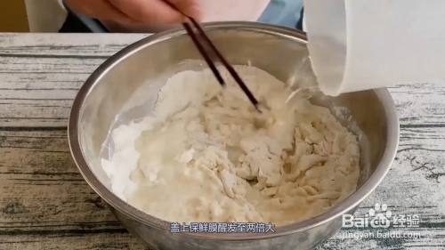 300克面粉中加入3克酵母、3克糖,用230克温水和面,盖上保鲜膜醒发至两倍大。