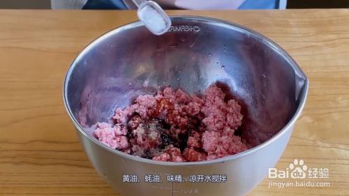 肉馅中加入花椒粉、盐、生抽、老抽、黄油、蚝油、味精、凉开水搅拌,腌着。