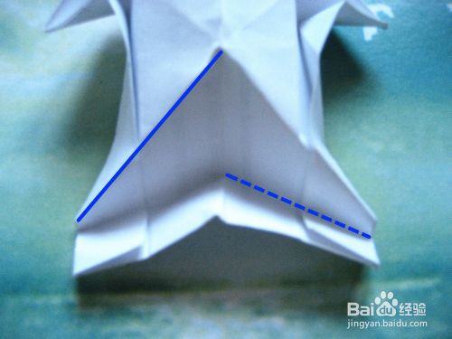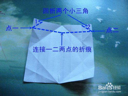 打开纸张,如图一所示:沿点一、点二的连接线向内折,然后回折出两个小三角。如图二所示。