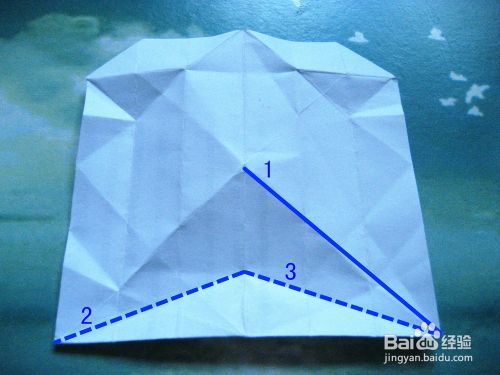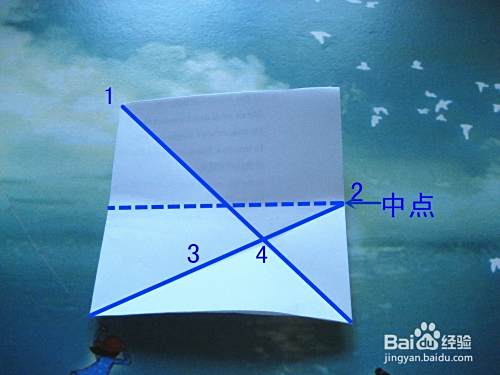 2. 底边向上,折向对角线,折出直线2,直线3;