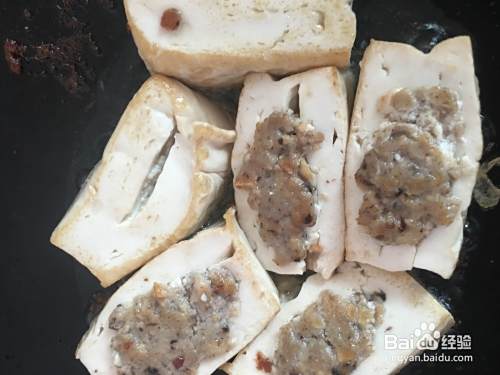 将豆腐切开一条口子,将肉馅塞入豆腐口中,动作需轻柔,不然豆腐很容易散掉