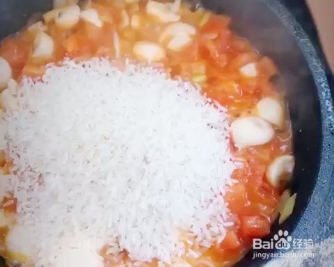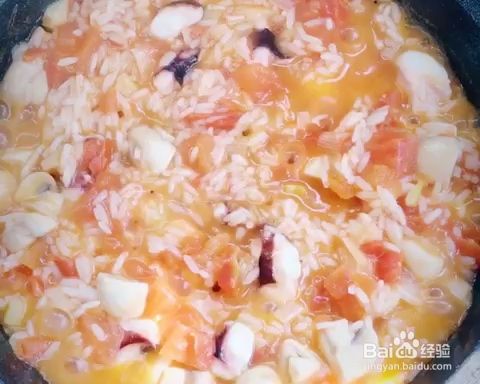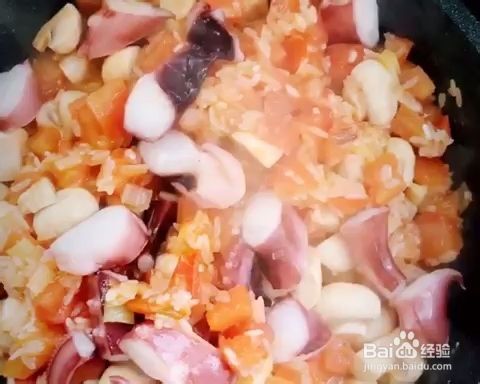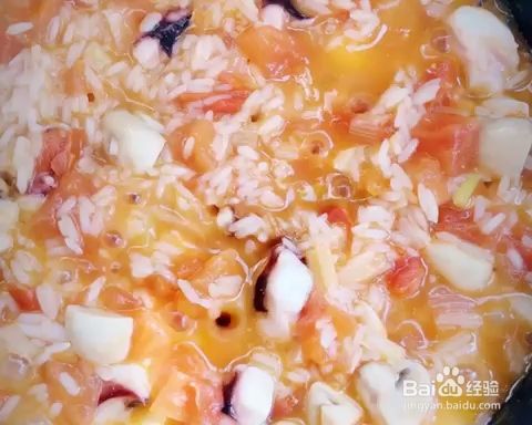 把米饭翻炒至吸收,然后把章鱼翻炒