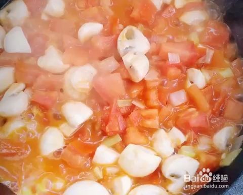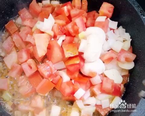把西红柿炒成汁,然后洋葱和口蘑炒成汁