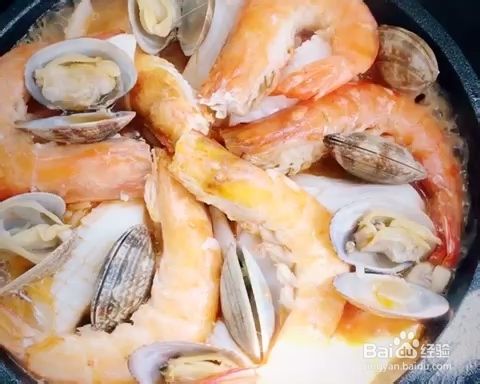 把鱿鱼和虾一个一个地放好,然后放上蛤蜊!盖上盖子继续炖!