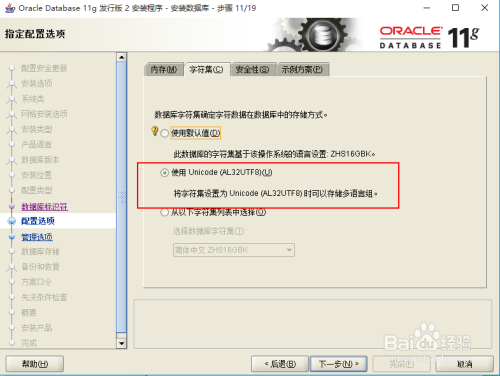 选择字符集使用 Unicode (AL32UTF8),点下一步