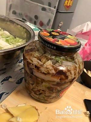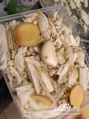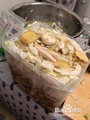 助手扒完蒜切完姜就可以去清洗容器了。没有助手就再让白菜在盐水里多等一会儿吧。热水冲烫干净的瓷罐、玻璃罐为佳。今年自己住在外面临时没找到罐子,找了个收纳桶也一样能用。