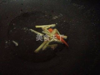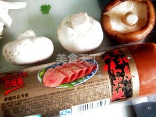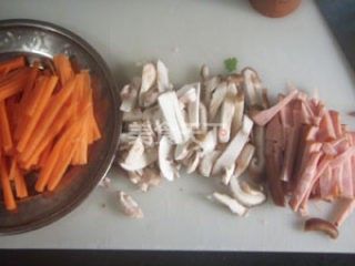将胡萝卜 香菇 蘑菇 火腿 姜 都切丝 。