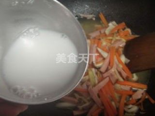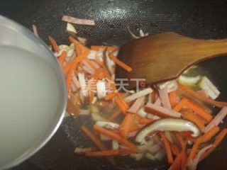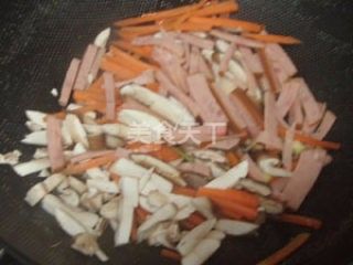 再依次放入胡萝卜丝 香菇丝 蘑菇丝 火腿丝 翻炒均匀。