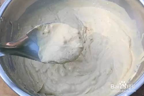 再放入半碗面粉,再次倒入适量的温水拌成粗线条的状态即可。