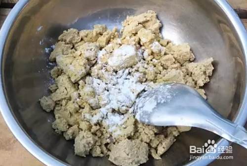 然后加入适量的白糖、食用碱,加适量的温水拌均匀至粘稠的状态,静置10分钟。