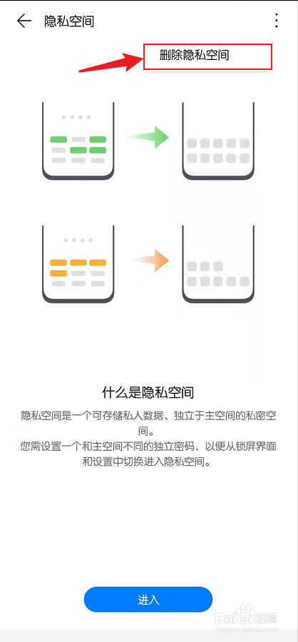 3、点击【删除】,输入主空间密码,完成隐私空间删除