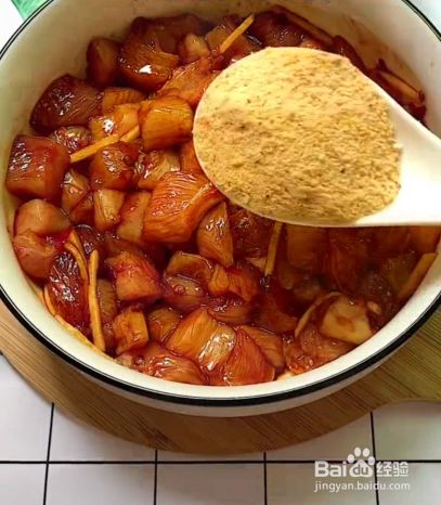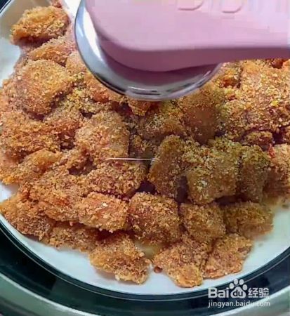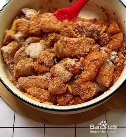用勺子将蒸肉粉和肉丁充分搅拌均匀,使每一块肉丁都均匀地裹上蒸肉粉。(蒸肉粉的量可以看鸡胸肉的多少而适量的增加或者减少,这个没有固定的量)