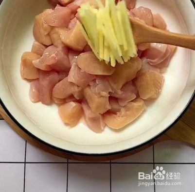 鸡胸肉清洗干净之后,切成小丁装碗备用。然后加入少许的姜丝、半勺料酒、半勺白糖、一勺生抽、一勺花生油搅拌均匀腌制半个小时备用。