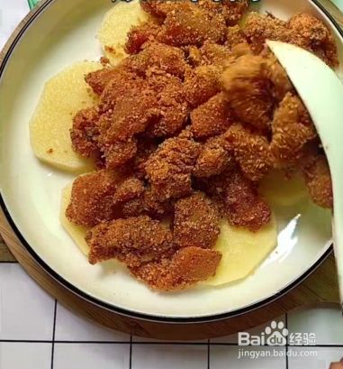 土豆切成薄片均匀地摆在盆子的底部,然后将搅拌好的鸡肉丁均匀地铺在土豆上面,尽量将鸡肉丁铺得均匀一些吗,不然蒸的时候,会出现有些熟有些不熟的情况。