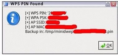 这就是PIN 出来了,如果没记下不小心点了OK 可以按上图Backupin:/tmp/minidwep MAC.pin 这个文件找回来。或者晚上挂着早上来看什么也没了可以到Backup in:/tmp/minidwep MAC.wpc 找回,看pin 到哪里。