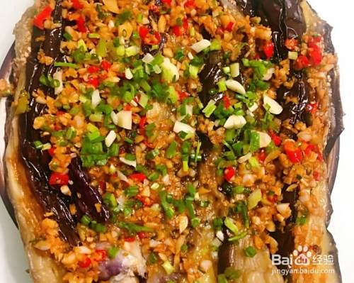 趁热浇上炒制好的剁椒蒜蓉葱末酱,再撒上前面剩下的葱花,一道美味简单又超级下饭的剁椒蒜蓉蒸茄子就做好啦