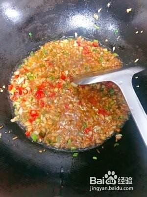 起锅热油,油快要冒烟时关小火、倒入盐、剁椒,翻拌几下倒入蒜蓉、葱花,一部分葱花留着后面还需要。关火翻拌,一定要关火哦,否则蒜蓉辣酱等都会被烧焦,调料炒香后倒入适量生抽,再开小火搅拌约一分钟,关火