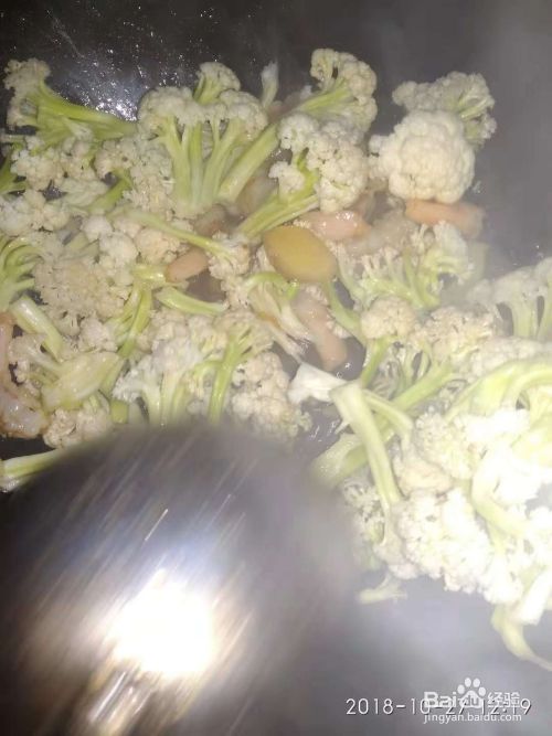 虾仁变色后放入菜花,并放入盐,持续翻炒,熟后出锅即可