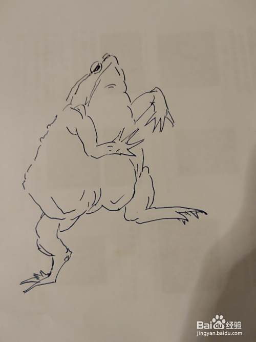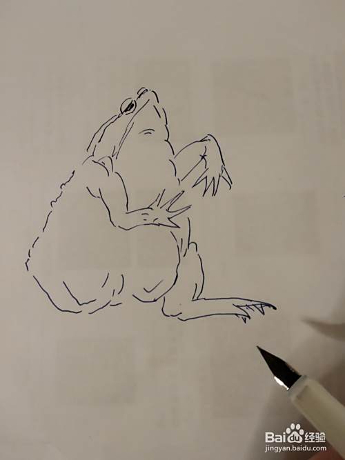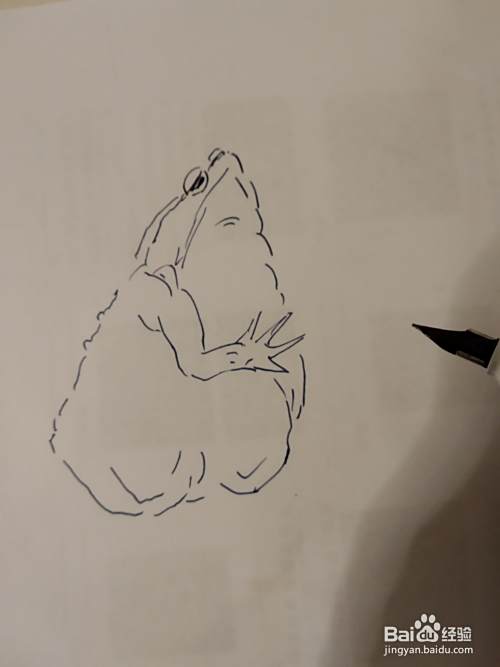 画癞蛤蟆的线条,要一段一段的画,有大小不同的起伏表现出它身上的肌肉。癞蛤蟆的背部有一个个凸起的小点,我们用笔把它圈出来。|