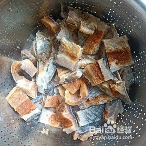 咸鱼在温开水里泡一晚,捞出剁成小块,清水冲洗后沥干备用。