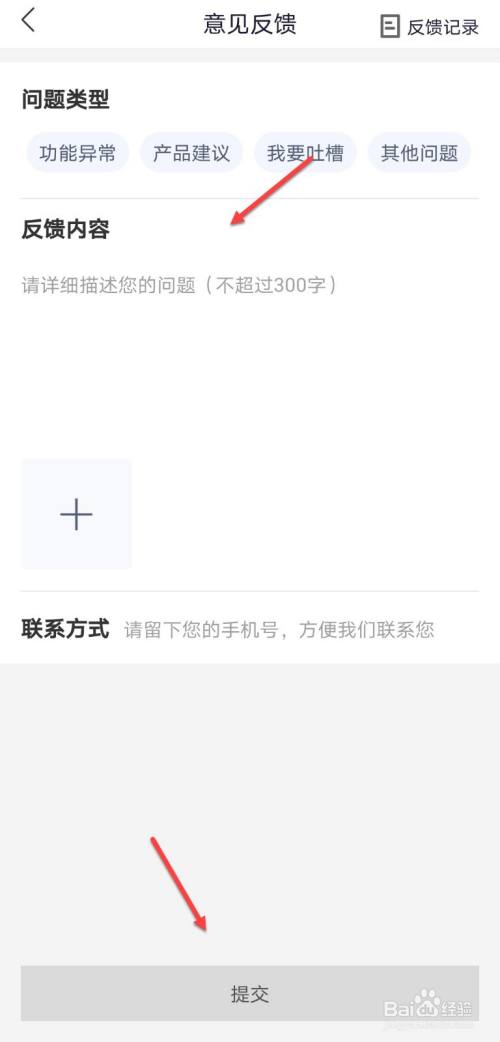 进入意见反馈界面,输入反馈内容,点击提交。