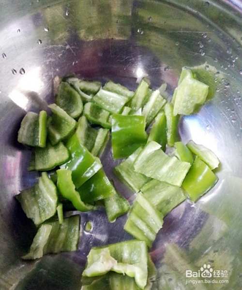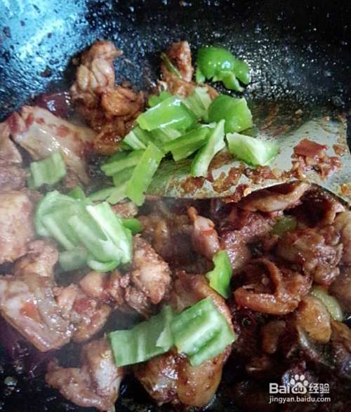 兔肉炒熟了,放入青椒块,翻炒均匀