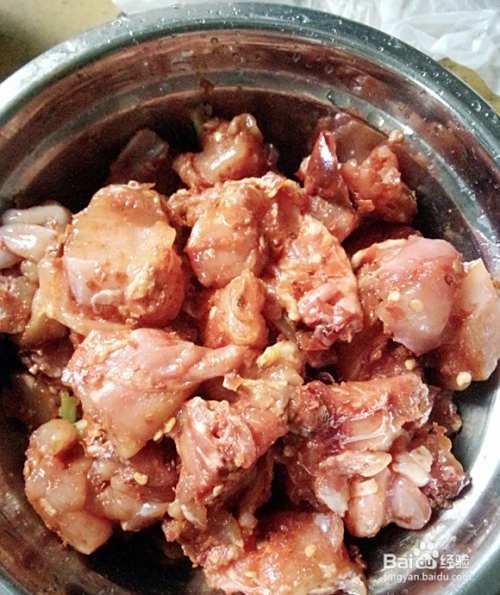 鲜兔肉洗净,斩块,拌入适量豆瓣酱、食盐、香油、料酒、花椒油、干淀粉、生抽、白糖搅拌均匀,腌制15-20分钟