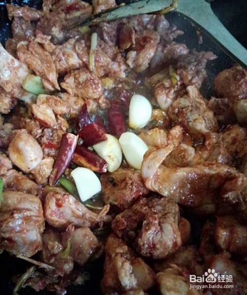 兔肉炒至变色后,放入干辣椒、花椒、大蒜翻炒,更好的处理方法是:兔肉炒至变色,盛出,另起油锅,炒香干辣椒、花椒、大蒜后,将兔肉倒进锅里翻炒,我这样的做法,成品不会太辣