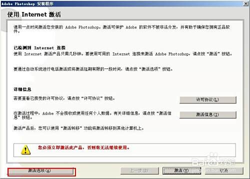 等软件安装完成后,软件是不能使用的,这时候我们呢会发现软件弹出一个使用Internet激活选项,我们点击这里的激活选项;