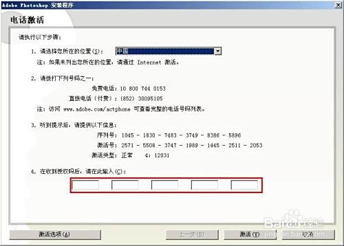 这时候会弹出一个电话激活页面,我们可以看到里面有一个输入框,要我们输入受到的授权码,这时我们就要去运行注册机获得授权码了;
